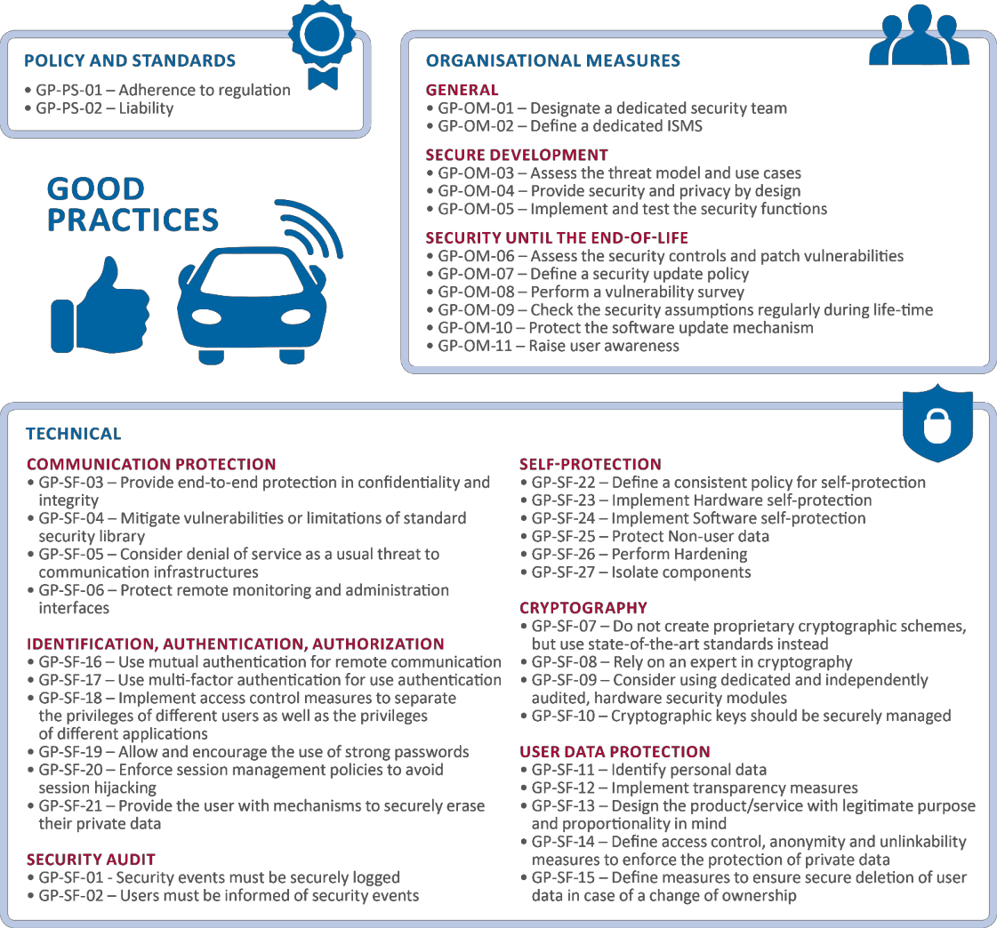 Las buenas prácticas incluyen un conjunto de acciones que pueden ayudar a mover la industria automovilística hacía una postura de concienciación ante la seguridad. A continuación, se enumeran las acciones: