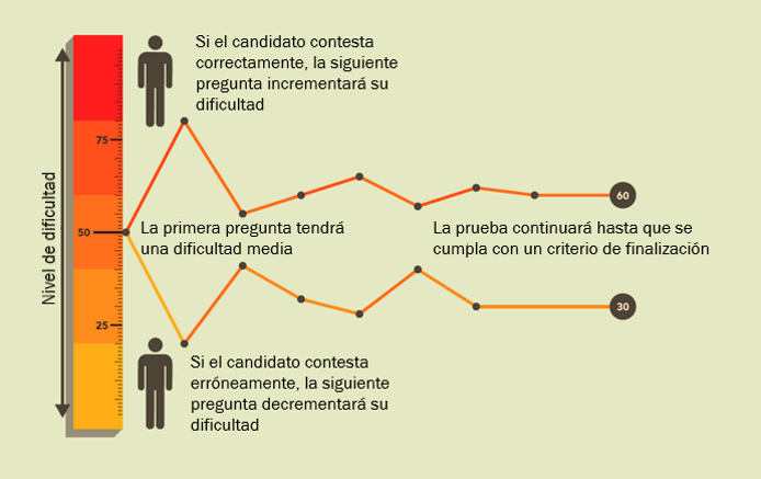 Mediante las pruebas adaptativas computarizadas el criterio de presentación de las preguntas al candidato varía de forma considerable respecto al modelo lineal. Ahora, cada pregunta es seleccionada con base en la respuesta de la pregunta anterior, maximizando la precisión del examen de acuerdo con el siguiente algoritmo iterativo: