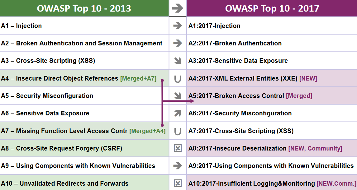 Como se puede observar, se han priorizado tres nuevos riesgos (A4, A8 y A10), dos han sido fusionados (A4 y A7 del 2013 en el A5 de 2017) y dos han sido retirados (A8 y A10 del 2013) debido al bajo porcentaje de aplicaciones afectadas hoy en día. Todo lo anterior demuestra que, a pesar del gran esfuerzo realizado para la protección de la infraestructura de aplicaciones web, las amenazas constantemente van evolucionando, quizás más rápido que la propia tecnología.