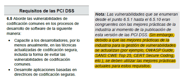 Desde sus primeras versiones, PCI DSS siempre citado a la OWASP como referente para la definición de directrices de codificación segura. Por ello, en el requisito 6.5 “Aborde las vulnerabilidades de codificación comunes en los procesos de desarrollo de software” se citan las guías de la OWASP como mejores prácticas de la industria a ser empleadas para estas acciones, en conjunción con las guías del CERT (