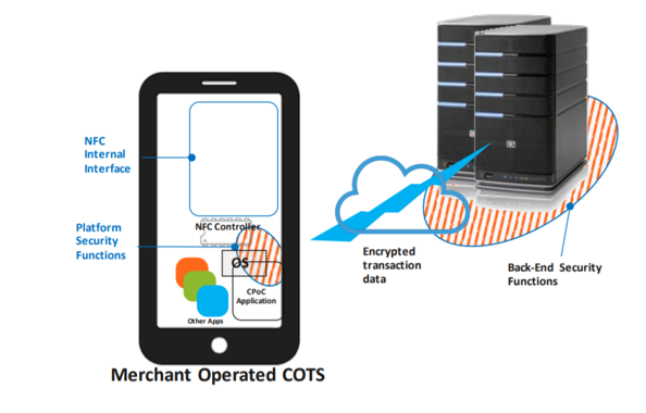 Los componentes hardware que están involucrados en el alcance son los llamados dispositivos COTS (Commercial off-the-shelf) o componentes de caja cerrada. Estos dispositivos móviles del comercio están diseñados para ser distribuidos masivamente al mercado y pueden ser, principalmente, teléfonos inteligentes o tablets. Dichos dispositivos capturan los datos de tarjeta a través de NFC, los cuales, a través de la aplicación CPoC son transmitidos para realizar la autorización del pago. Un ejemplo de esta integración se puede observar en el siguiente esquema:Hay que tener en cuenta que la aplicación CPoC, junto con el dispositivo COTS y los sistemas de back-end, conforman la solución CPoC. Esta arquitectura se observa en el siguiente esquema: