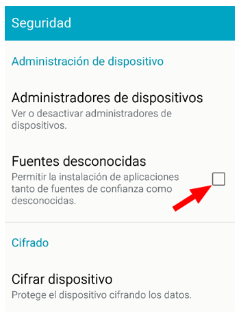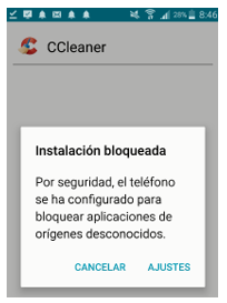 Si apareciera este mensaje, podemos ir a las opciones de configuración y habilitar la opción “Permitir la instalación de aplicaciones tanto de fuentes de confianza como desconocidas”: