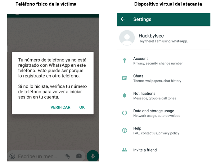 Desde este momento, ya tendríamos acceso al Whatsapp de nuestra víctima. A continuación, se muestran dos capturas a modo de ejemplo: una con el dispositivo físico al que hemos suplantado y otro con el dispositivo virtual emulado con el Whatsapp de la víctima.