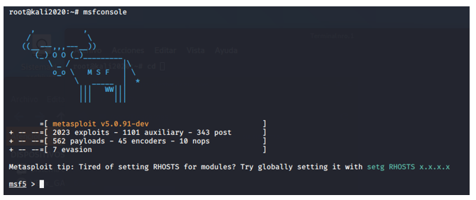 Para que todo esto funcione, necesitamos poner un puerto a la escucha. Utilizaremos Metasploit. Para ello lo arrancamos con el comando “msfconsole”: