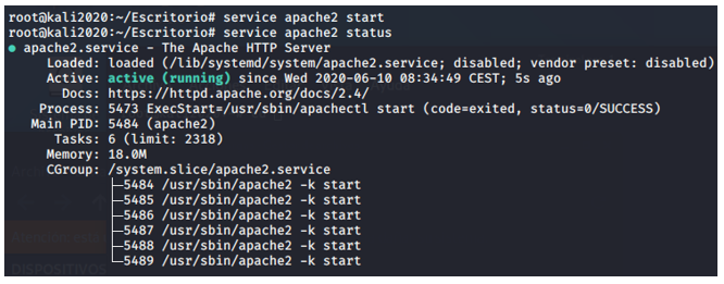 Para ello, ejecutamos el comando “ service apache2 start”. Y con “ service apache2 status” verificamos que ya está arrancado.