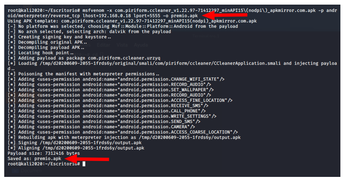 Como podemos ver en la siguiente imagen, se realiza todo el proceso de firmas, se decompila el APK, se inyecta el payload, se asignan los permisos, y se reconstruye el APK para generar nuestra aplicación mailiciosa.