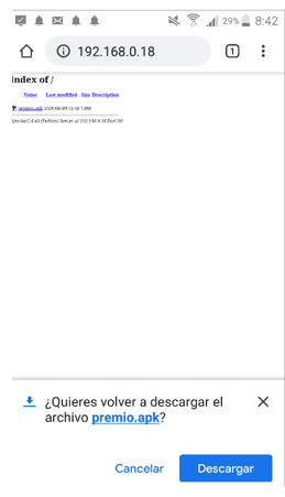 Si visitamos ahora la dirección http://192.168.0.18 desde nuestro dispositivo, podemos ver nuestro APK. Al hacer clic sobre él, podremos descargarlo e instalarlo: