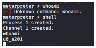 Por ejemplo, “whoami” no funciona por defecto. En cambio, si ejecutamos “shell” previamente, podremos ejecutarlo y conocer el usuario con el que estamos autenticados: