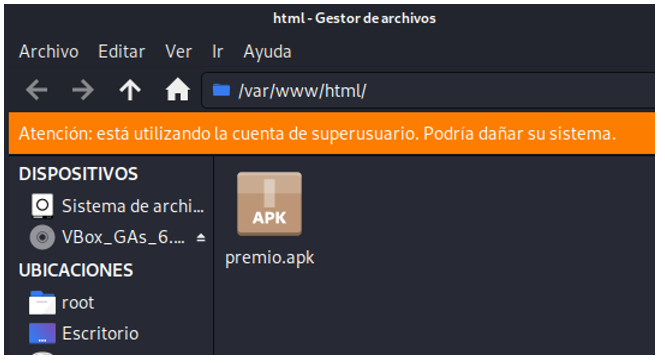 Ahora movemos nuestra aplicación “premio.apk” dentro del directorio “/var/www/html”: