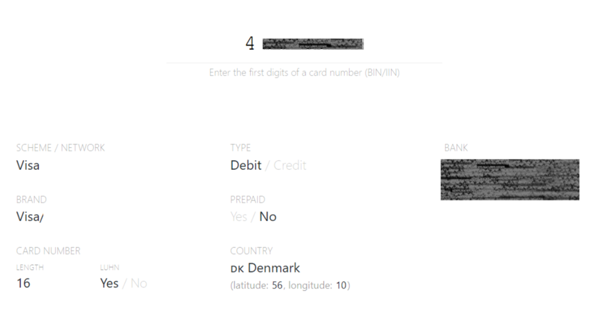 Hay multitud de páginas web y de APIs disponibles para extraer la correlación de datos relacionados con un número IIN. Por ejemplo, dado un IIN de 8 dígitos, en la página web Binlist, se obtiene la siguiente información: