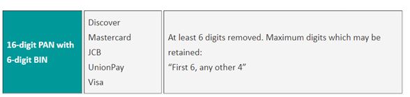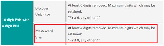 “ For Requirements 3.4, the maximum digits of a PAN that can be stored using truncation are “first six and any other four.” Mastercard’s acceptable truncation format has not changed as a result of the 8-digit BIN expansion mandate. If an entity needs to store more than “first six and any other four,” then truncation cannot be used to meet Requirement 3.4 and one of the other three approaches would need to be applied to render the PAN unreadable anywhere it is stored.” (Mastercard, 2018)