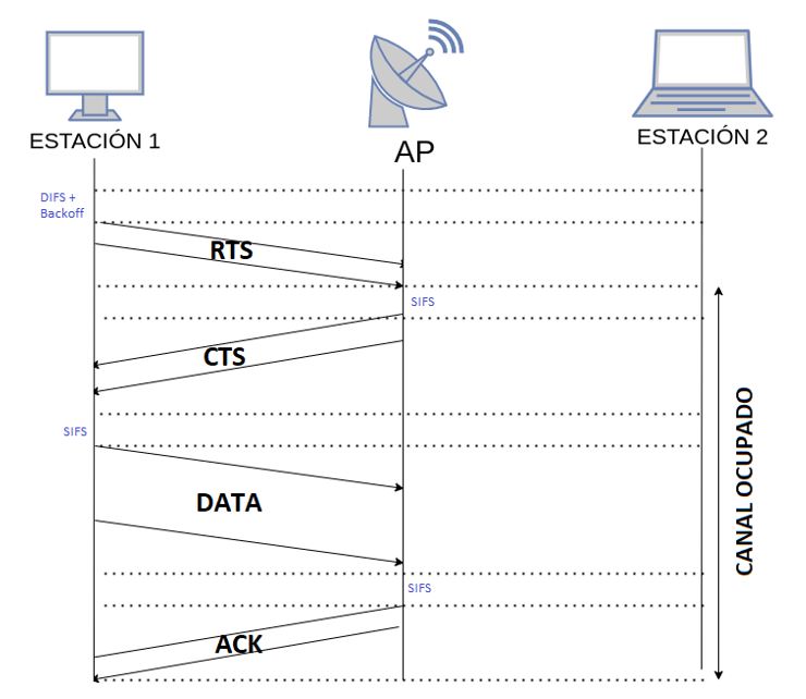 Una vez comprobado que el medio está libre y no hay nadie transmitiendo, que la propia base detecte claro está, preguntará a la estación base su deseo de transmitir (RTS). El receptor, que sería la estación base o punto de acceso envía la respuesta (CTS) donde transmite a todos los miembros de la estación que el medio va a estar ocupado por la estación solicitada. De esta forma gracias al RTS/CTS el problema de los nodos ocultos desaparece, ya que es la propia estación base la encargada de controlar y avisar a todos los miembros de la red que el medio va a estar ocupado.