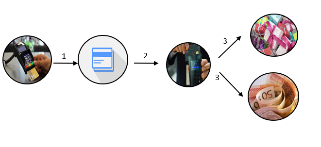 Nota: La figura representa el conjunto de pasos que puede llevar a cabo un ciberdelincuente con el fin de utilizar los datos capturados de forma fraudulenta en un pago con chip. La figura es de elaboración propia, y las imágenes que la conforman han sido obtenidas de un banco de imágenes bajo la licencia Pixabay. https://pixabay.com/service/license/