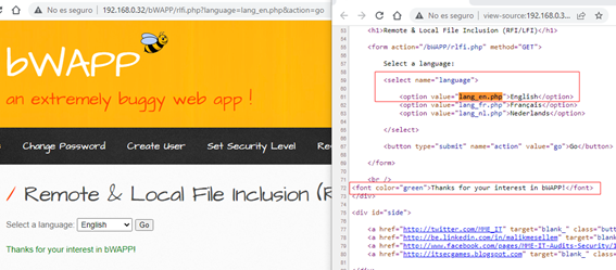Como vemos, el primer parámetro llama al archivo lang_eng.php que solo extrae el texto de “ Thanks for your interest in bWAPP!”