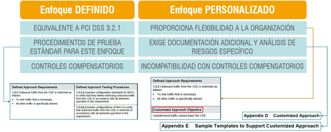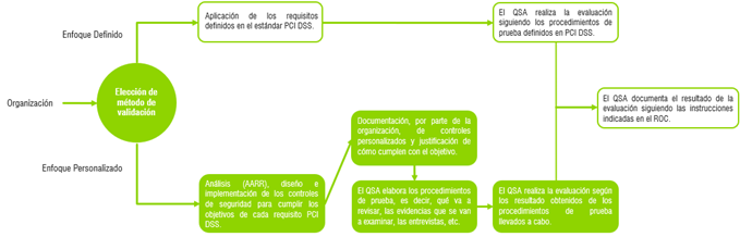La entidad que debe evaluar un entorno bajo el estándar PCI DSS en su versión 4.0, antes de nada, debe ser consciente de que dispone de dos vías o enfoques para su consecución, por un lado el enfoque definido o tradicional y, por otro lado, el enfoque personalizado. Ambas vías se pueden apreciar en el siguiente diagrama de flujo: